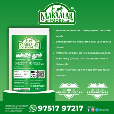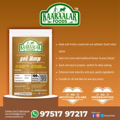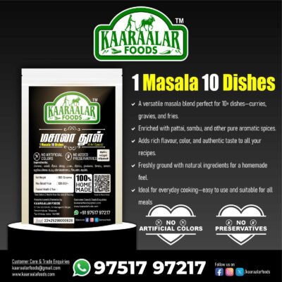 At Kaaraalar Foods, our homemade masala blends bring the authentic flavors of carefully selected spices straight to your kitchen. Crafted with natural, high-quality ingredients, each masala is a perfect balance of aroma, taste, and tradition, ensuring your meals are flavorful, wholesome, and truly memorable.