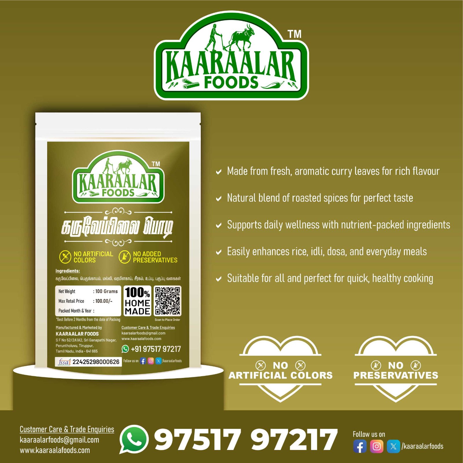 Add a burst of flavor and nutrition to your everyday meals with Kaaraalar Foods Curry Leaf Powder, made from fresh curry leaves that are carefully cleaned, shade-dried, and finely ground. This traditional powder enhances taste while delivering natural health benefits.